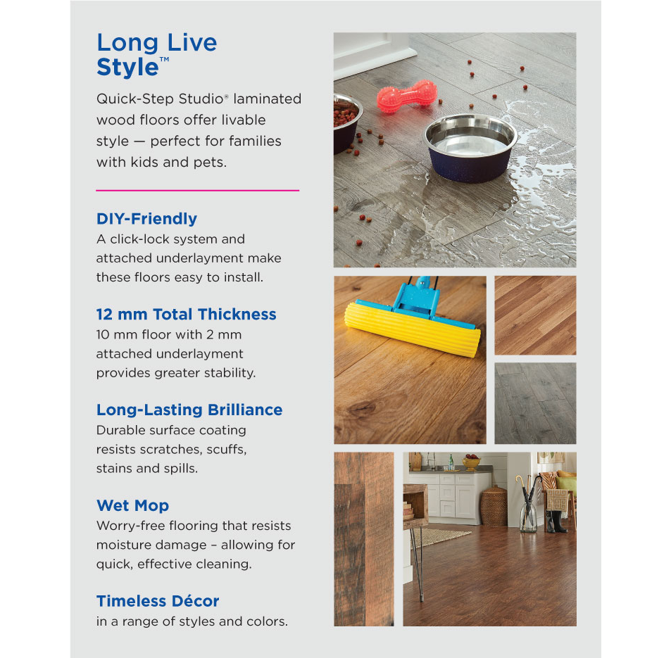 Product Features 4456 when you choose 5 savings on eligible purchases every day. Learn how QuickStep Studio waterproof laminate flooring with a SpillRepel guarantee that protects. QuickStep Studio laminate flooring comes with and is subject to the terms of this 5-year Limited Commercial Warranty.